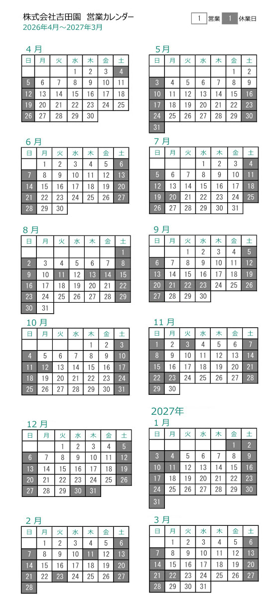 4月から一年間の営業日は、下記表の通りでございますので、変わらぬご愛顧の程よろしくお願い